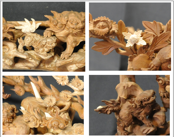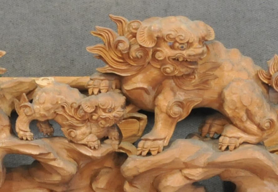 見どころとしては何といっても瀬川の獅子。現代のフィギュア顔負けの精緻な彫刻。ひのき材の良さはもちろん、刃物が常にベストな状態でないとこのような細かい表現は不可能です。獅子の躍動感・表情もそれぞれとても豊かです。大きな彫り物ならばやりやすい表現を、小さな彫刻に落とし込んでいる。瀬川治助の腕の冴えを見られる素晴らしい彫刻です。