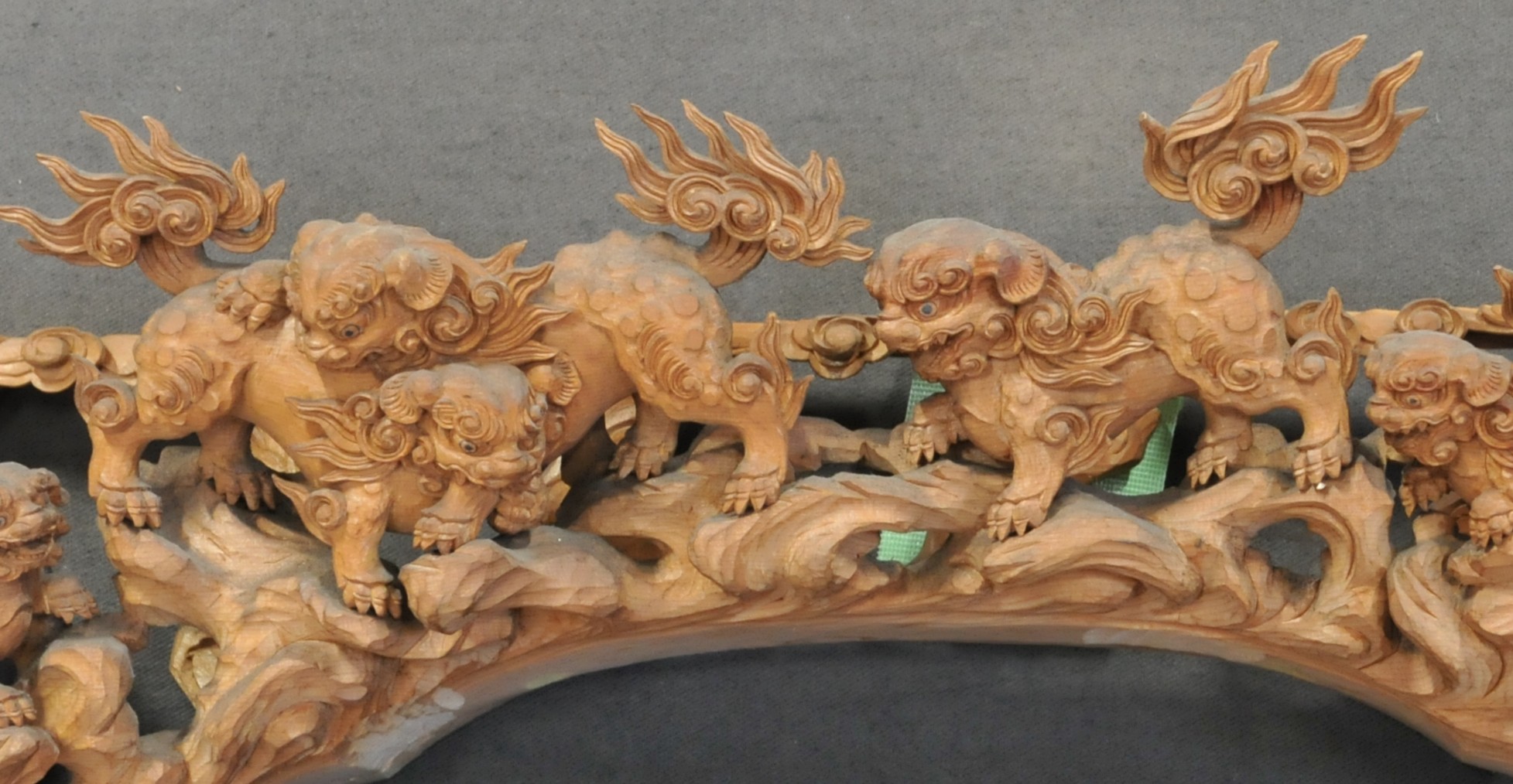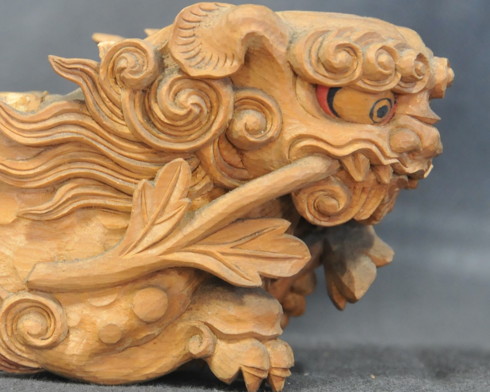 獅子の頭の上、龍の背中など凹凸の複雑なところにも容赦なくほこりが堆積しています。これらを全て清掃します。一括修理でしたら殆ど省ける工程ですが、今回はきわめて重要な工程です。