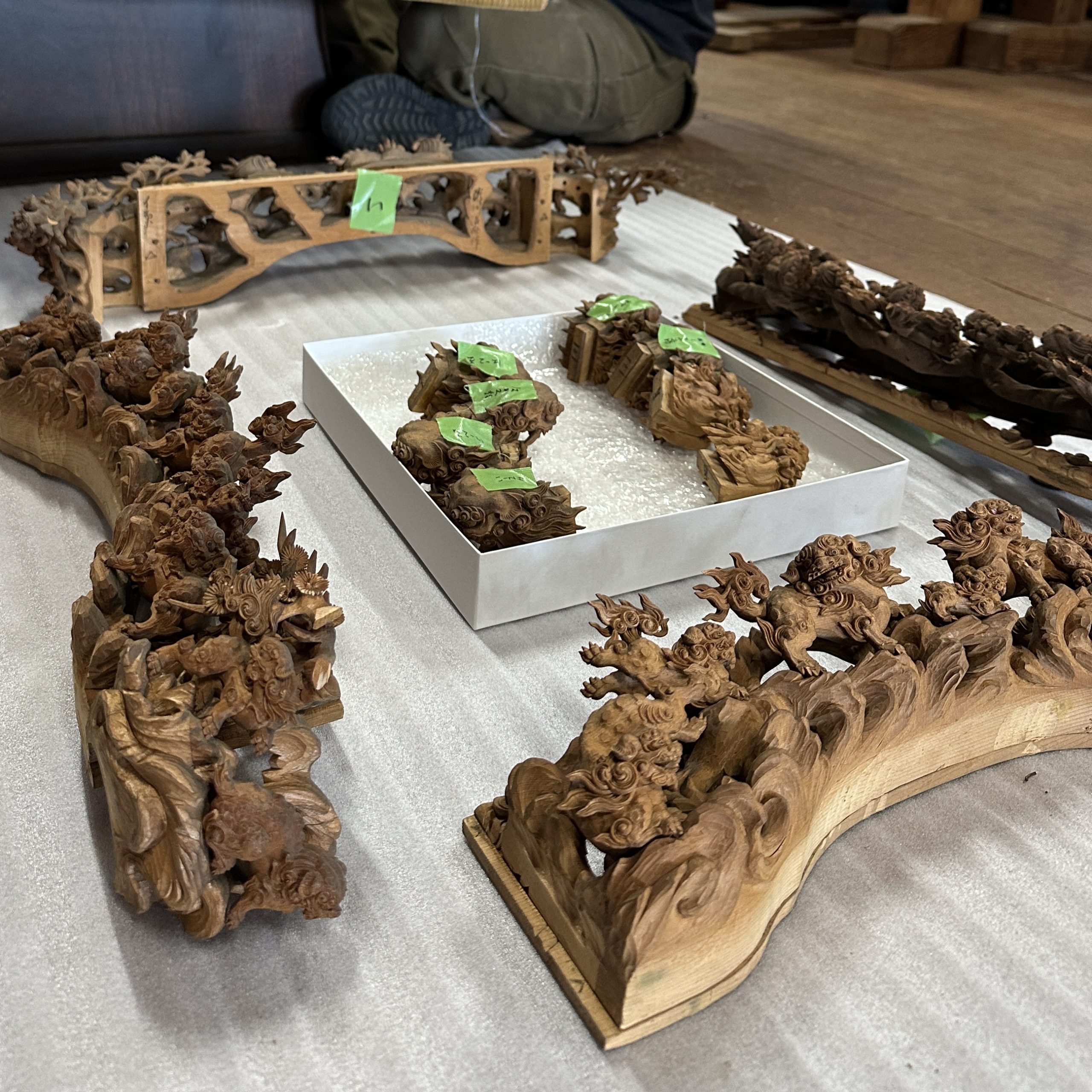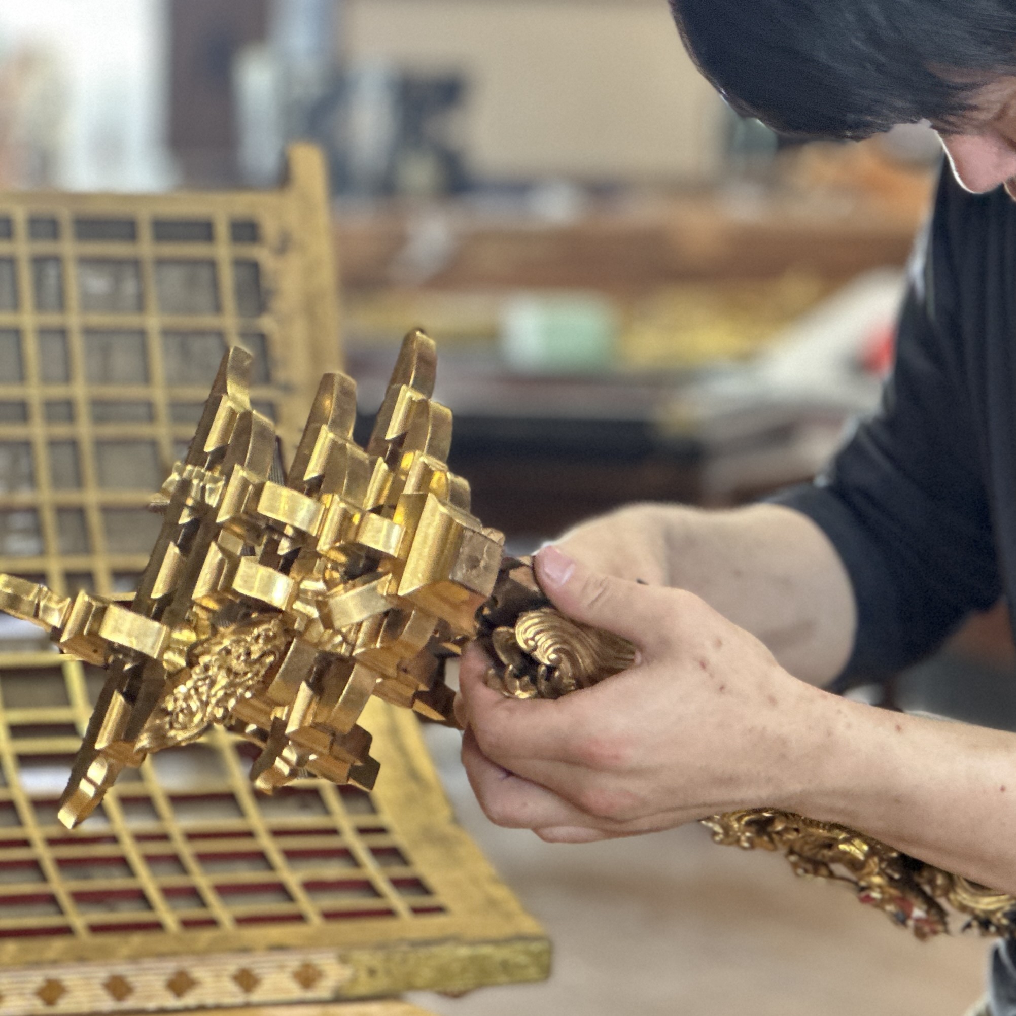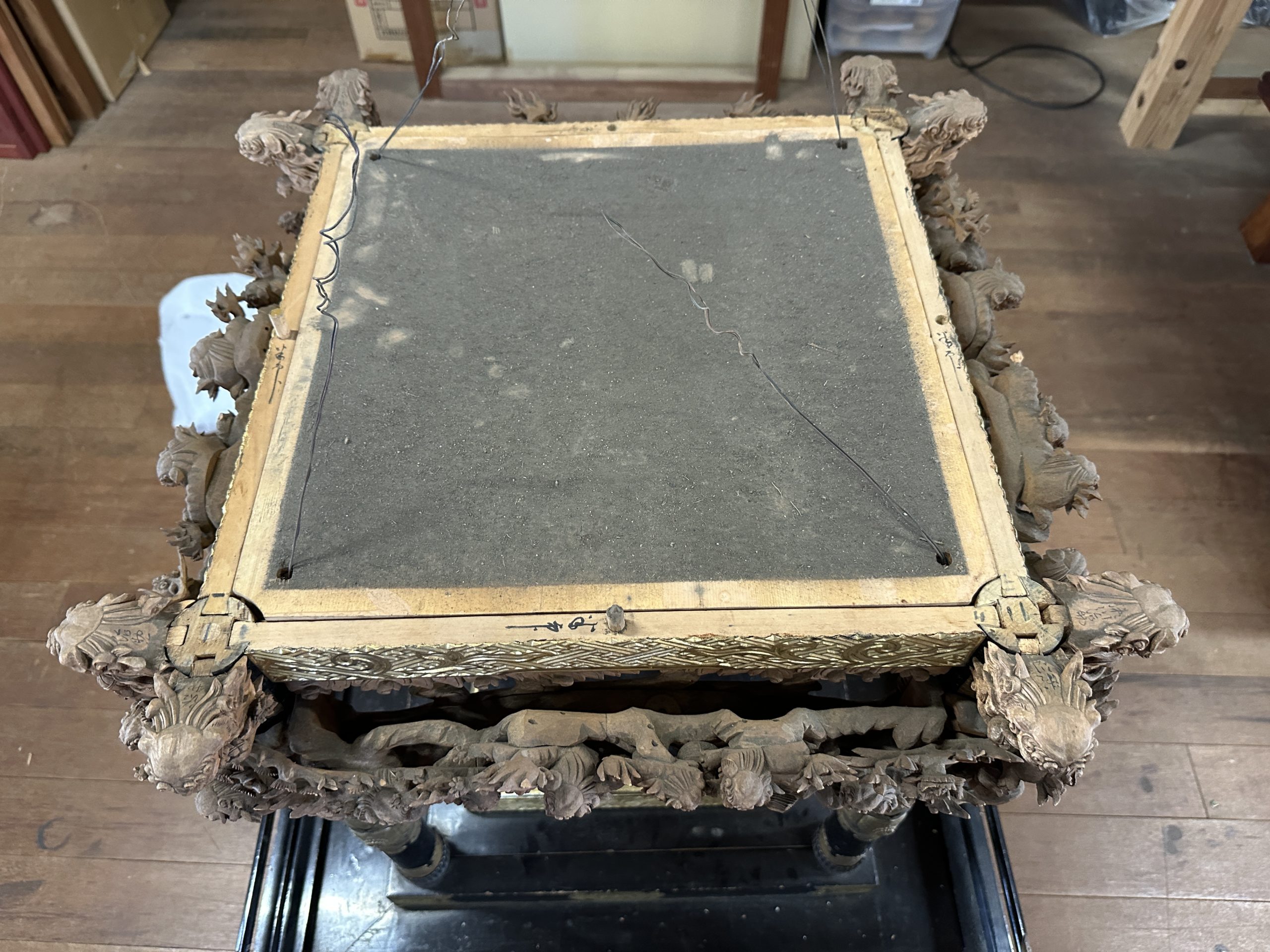 前半はほとんど解体・清掃が主な作業です。全体を撮った写真はなんとなくきれいに映りますが、近くで見てみると大量のほこりが堆積しています。これらを金箔・漆塗り・彫刻等表面を傷つけないように清掃します。