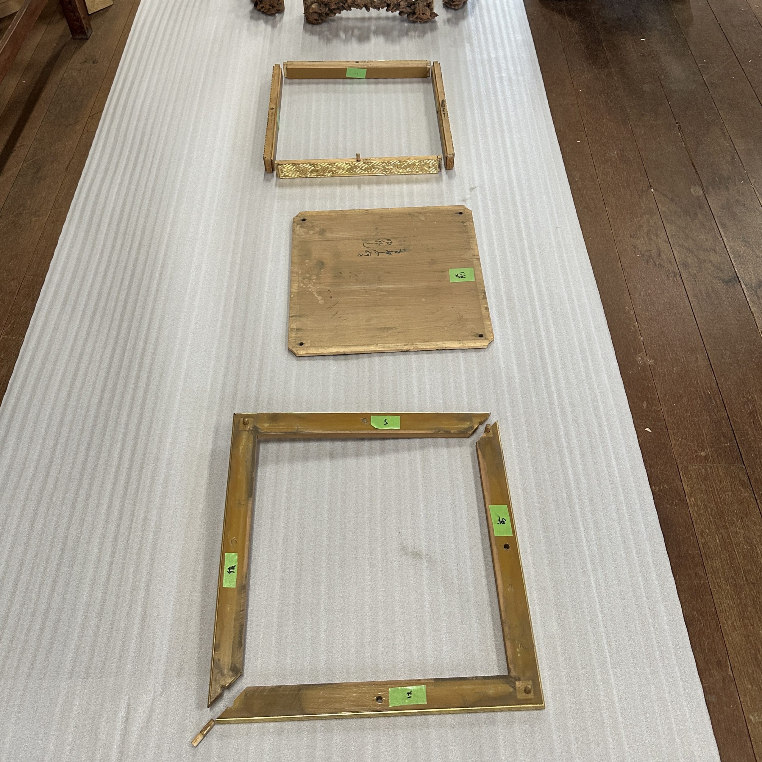 一方で、箔のすり減りが軽度で、古い仕上げの味わいがしっかり残っている金具もありました。これらは、経年変化がむしろ美しさの一部として働いているから、修理によって “古いものが持つ雰囲気” をすっかり消し去ってしまう危険性がある。そのため、これらは状態をととのえるだけに留め、そのまま未来へ引き渡す方針がふさわしいという判断が適当ではないか、という論調です。