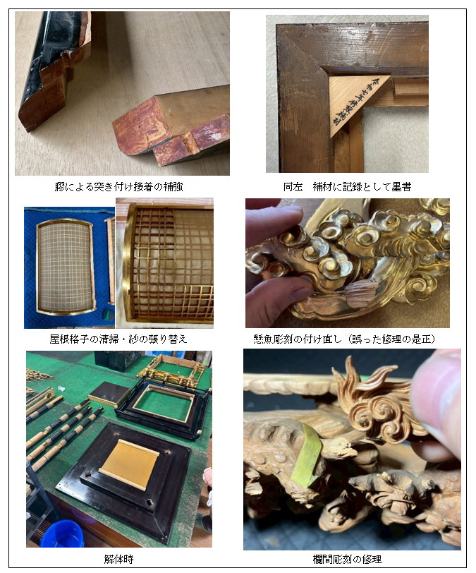 清掃の後は、構造部分の確認と必要に応じて修理です。多くの部分にゆるみや木の痩せが生じているので当て木をしたり、埋め木を行ったりして接合部が締まり利くようにします。脱落していた斗組や、破れていた屋根の紗の張り替え、獅子彫刻の亡失部分の補作を行いますが、決してオリジナルから逸脱しないよう、注意しながら進めていきます。