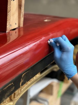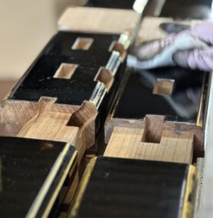 柵で囲まれ、あまり見えることがない土台部分もきっちり磨きます。漆みがきは生漆を使いますので、大物だと乾燥が難しく時期を選んで行う必要がありますが、預かり直後のくもった表面から見違えるような艶が戻ってきました。