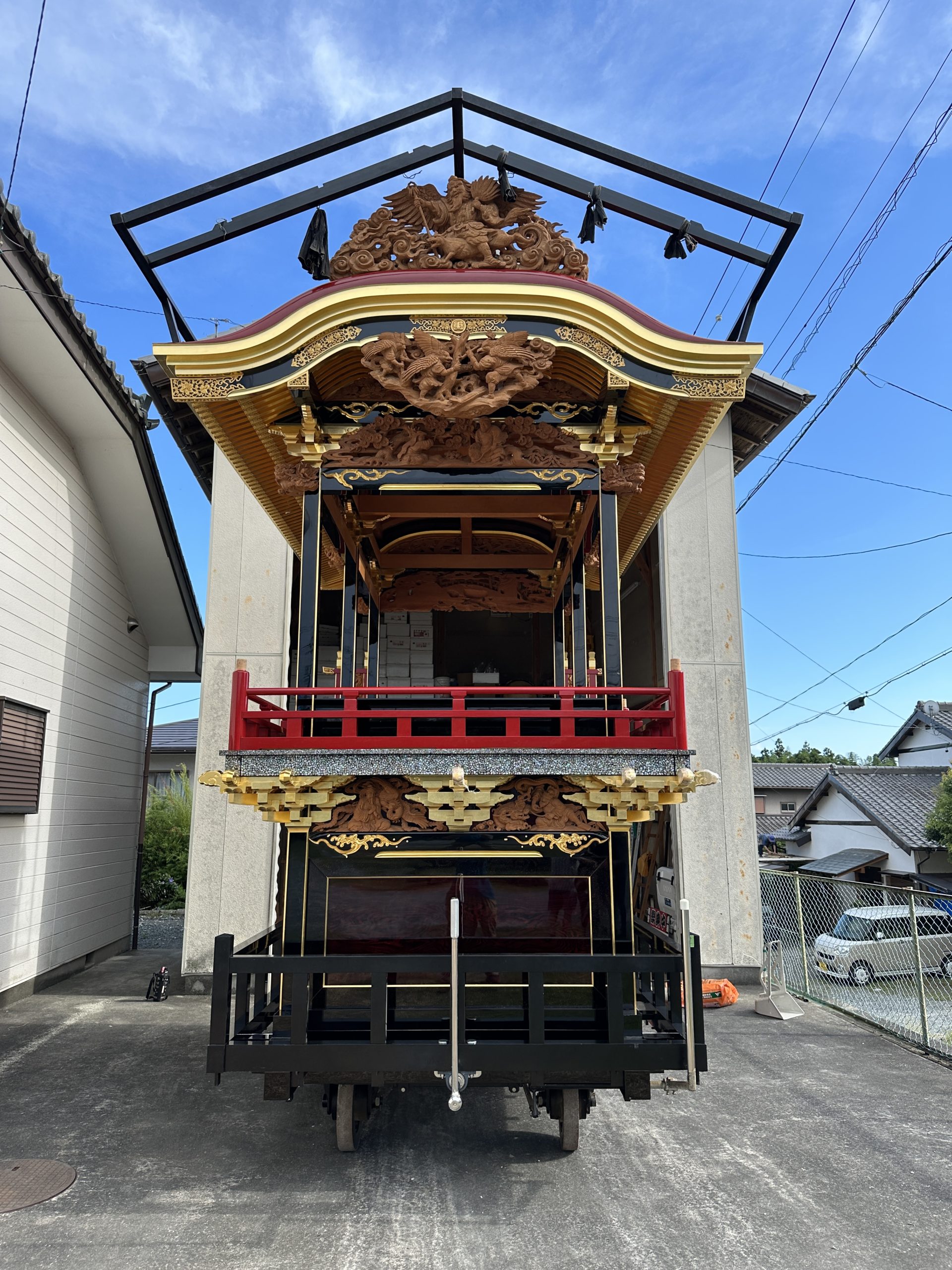 浜松市浜名区にある「根堅(ねがた)地区」天竜川が平地と山間部のさかいで大きく湾曲する山際に位置します。この一帯はお祭りどころで、多くの山車・屋台を見ることができます。根堅東組の山車は建立から30年が経過し、祥雲としてもいつもと違った試みとなる「全解体・漆みがき」という工事となりました。