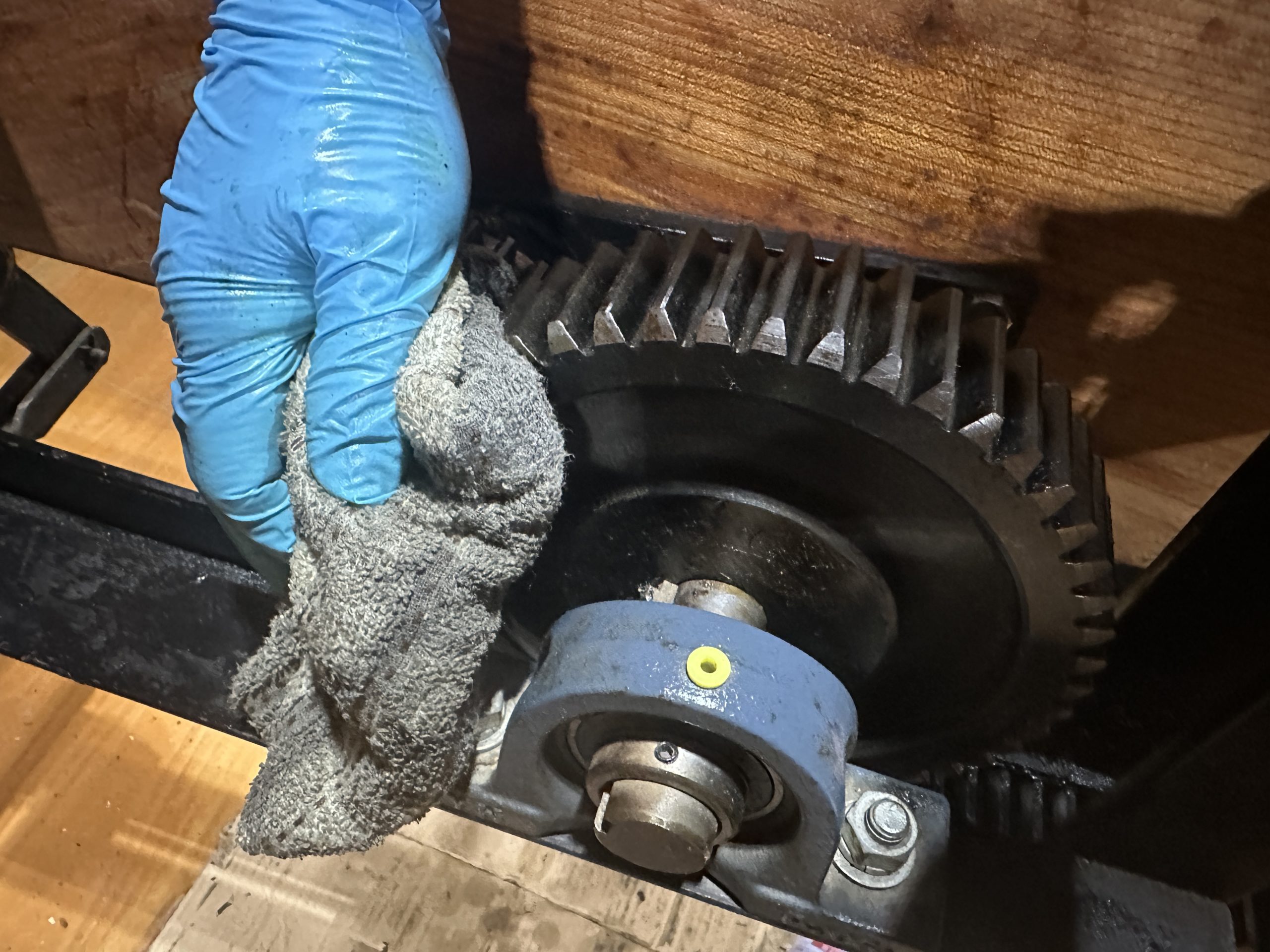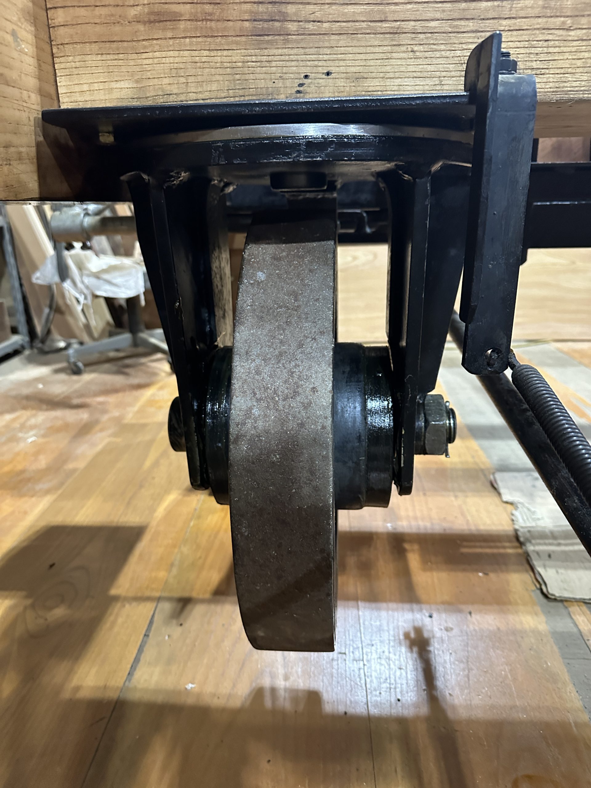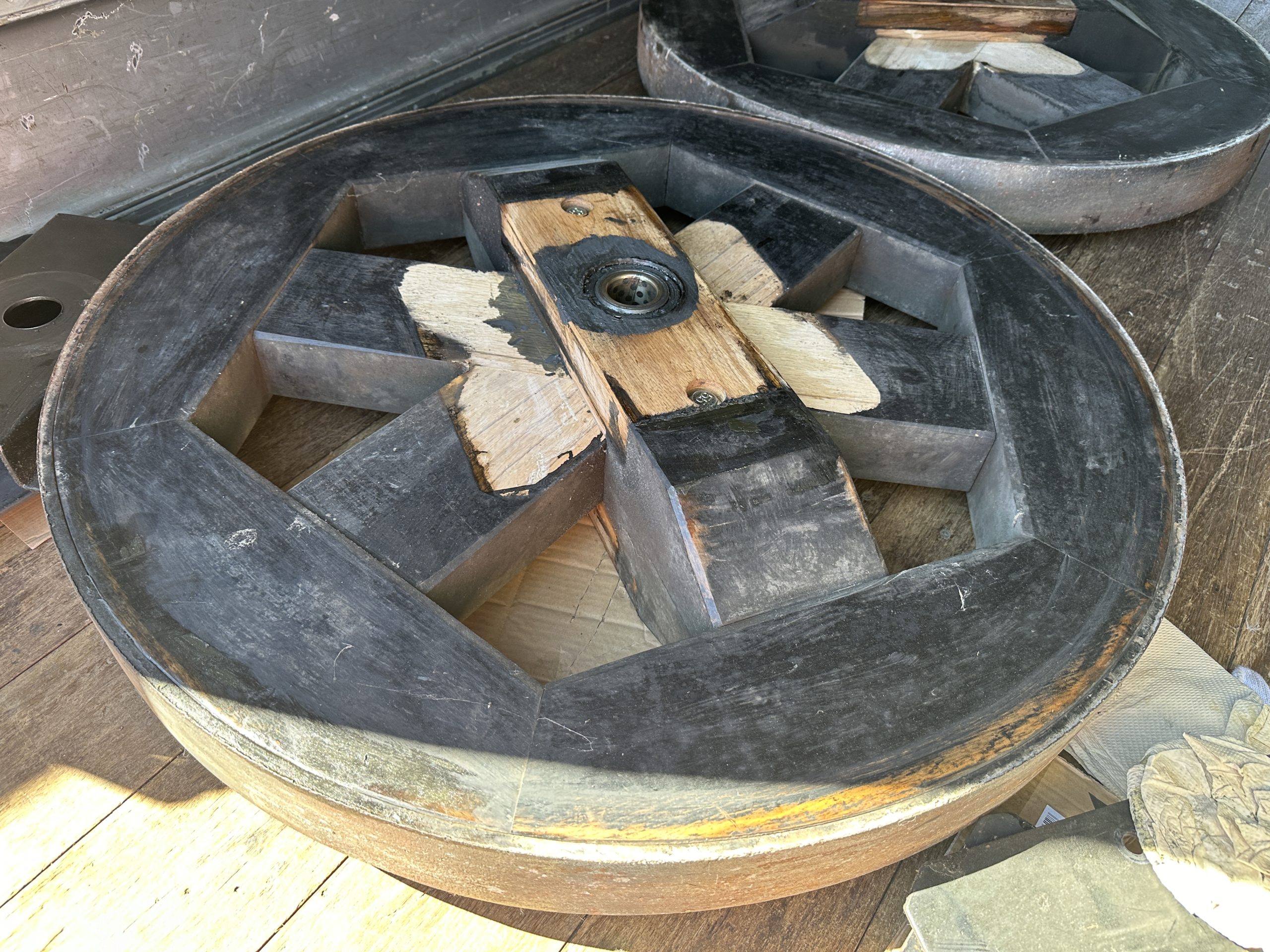 今回の事業のもうひとつの目的は車輪の修理を行うことでした。前輪は梶付きの小径車輪、後輪は直進固定の大径車輪です。分解掃除し、大量の砂利交じりのグリースを除去します。