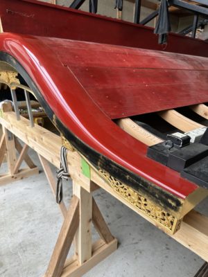 この形式の山車にとって腰板は”顔”であり、塗りのきれいさ・板(材木)の立派さを示す重要な部分です。腰板は「木地呂塗り」とい方法で塗り直します。木目を完全に消さずに活かす塗りで、けやきなどの板目を見せる技法として一般的です。