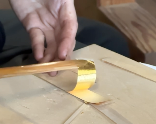 特に柱の四隅に押される「面金」は、山車全体のフォルムをはっきり鮮やかに見せます。下は、本件での柱面金箔押しの様子です。