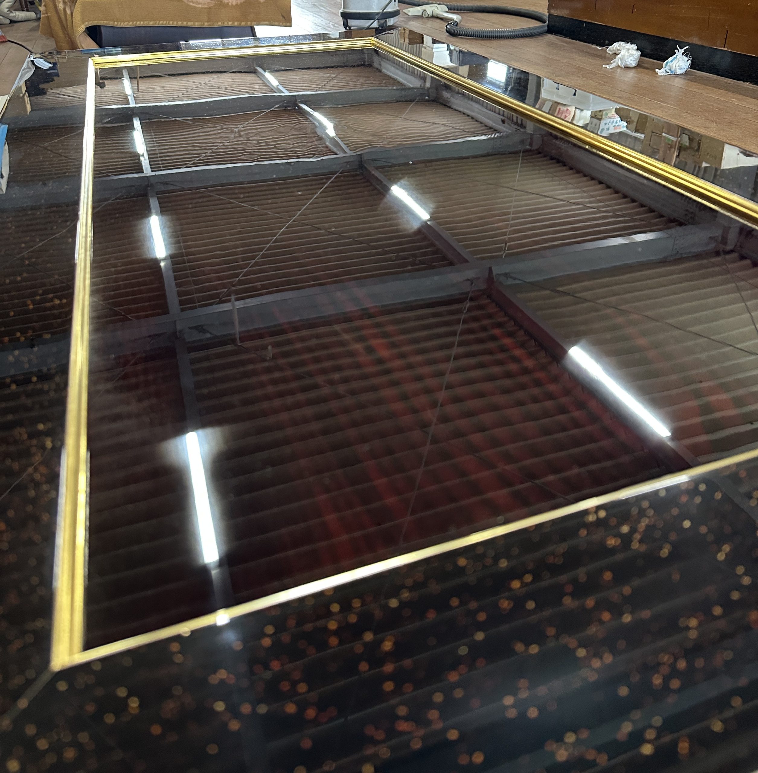 最初の赤茶色の写真が施工前。全体的に曇って艶が完全に引けています。つぎの二枚は塗り直し後。本物の天然漆だけを使い、建物の天井が歪みなく映るほどの艶です。漆には徐々に透けて(明るく)なる性質があります。数年かけて杢目もじっくり見えてくるようになるでしょう。
