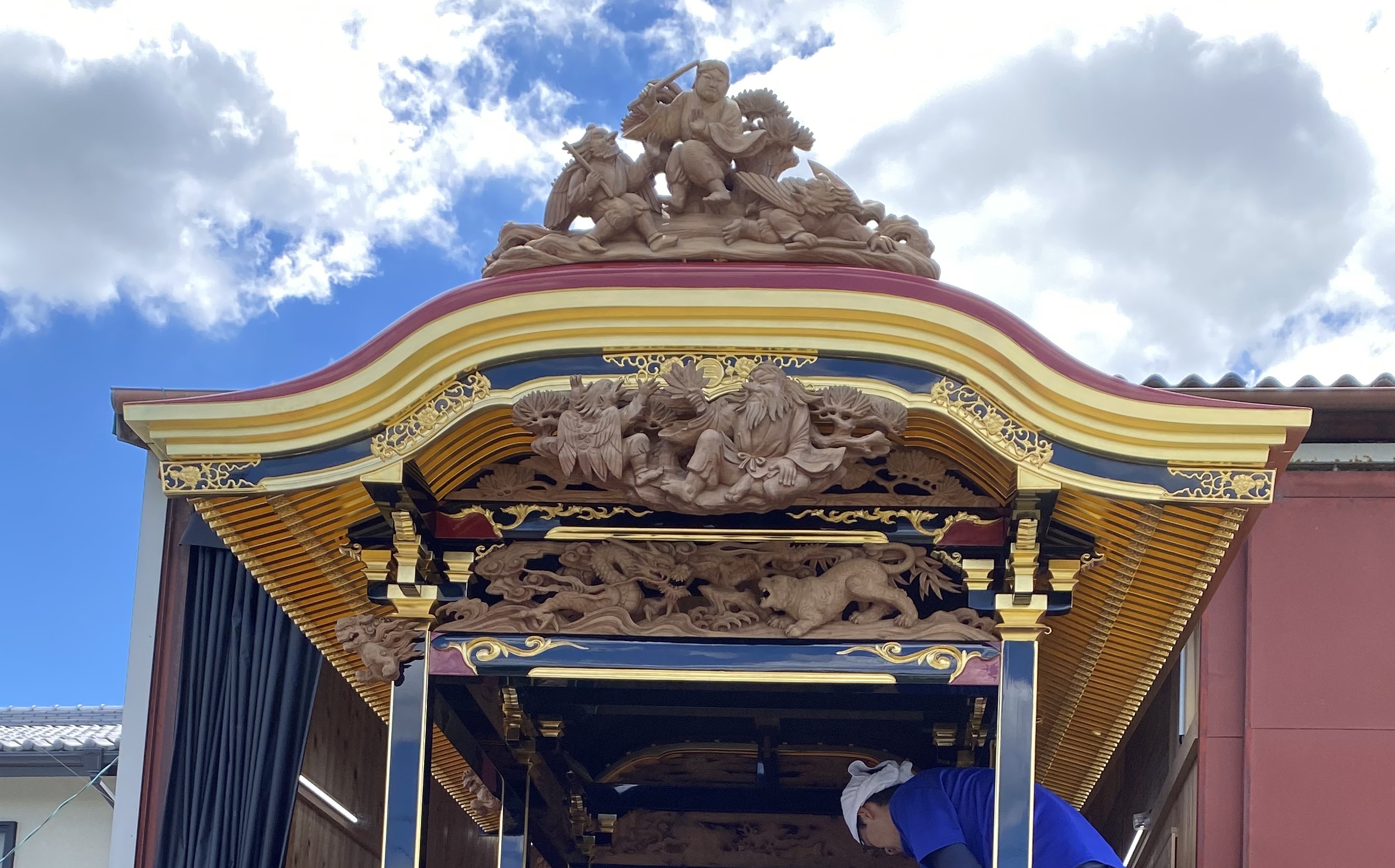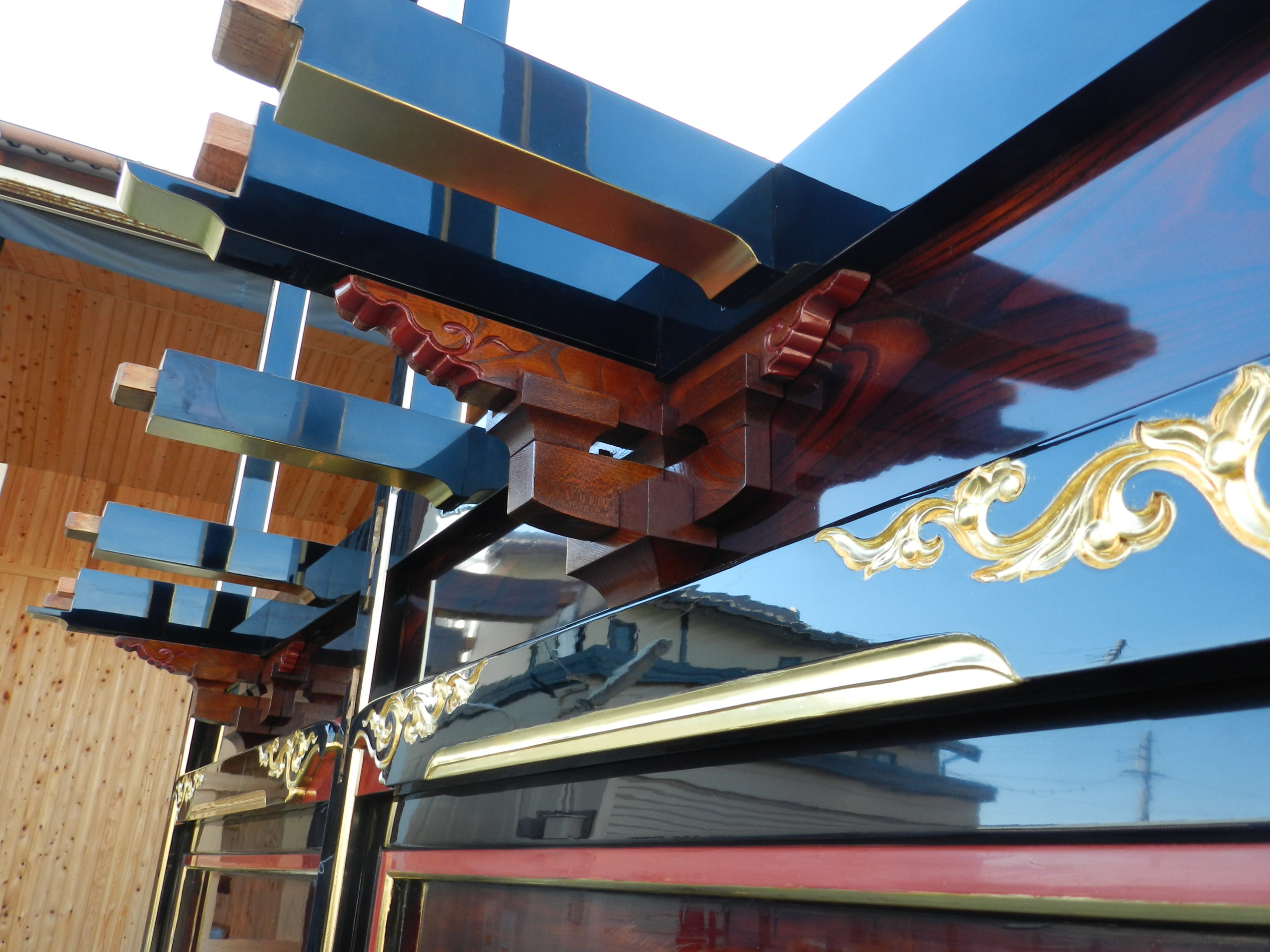 きれいなラインを見せてくれる唐破風。ここ遠州では伝説的な大工棟梁である坂田歌吉の技を継ぐ、小池佐太郎氏の作です。木地のままの良さもありましたが、やはり塗りを入れると黒・朱・金箔・錺金具が冴えてよりよく見えてきます。
