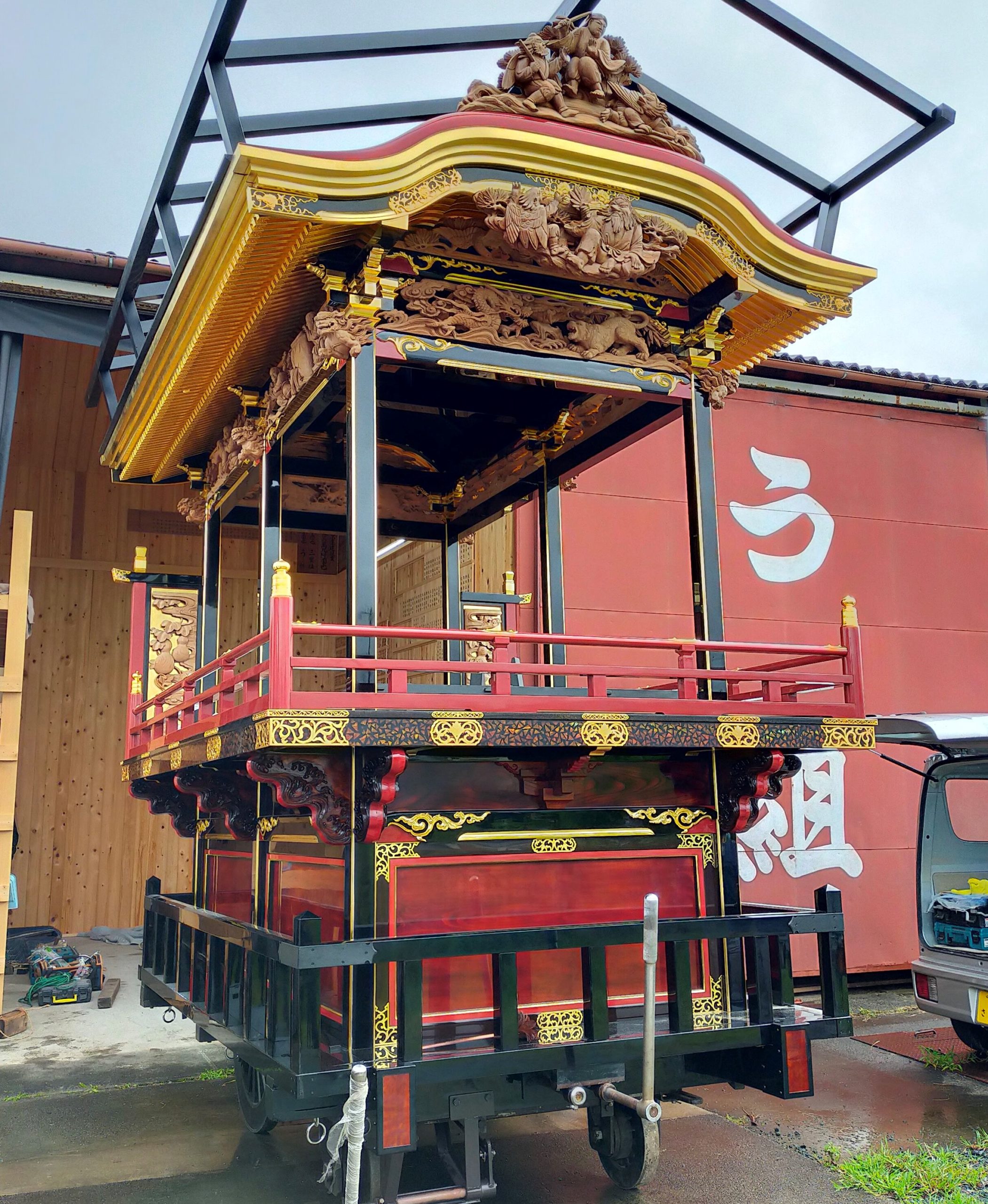 遠州掛塚の名工、坂田歌吉棟梁の流れをつぐ、小池工務店さんによる四輪内輪式一層唐破風屋根の山車。塗られていない状態からの解体・修理・天然漆塗りを施しました。