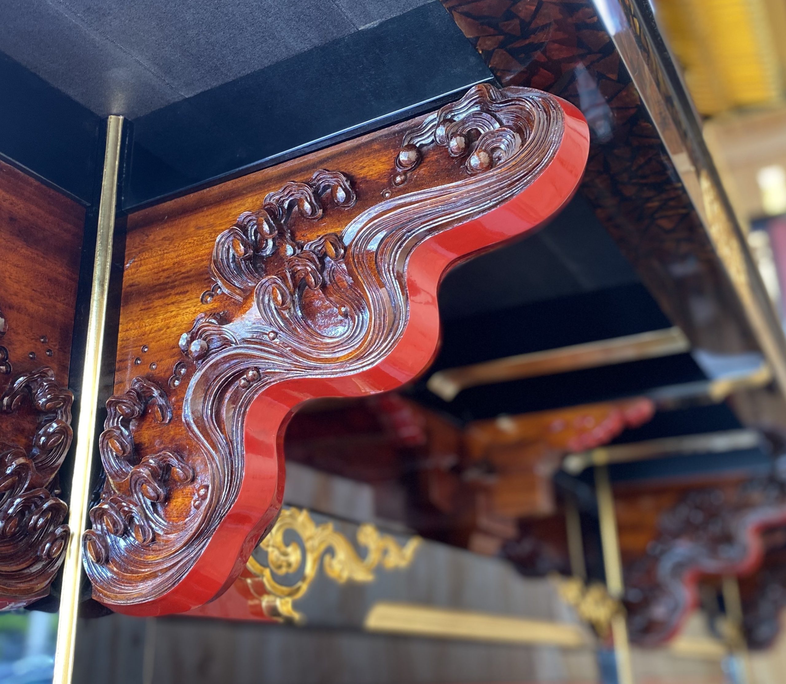 「波」彫刻には天然生漆を塗り重ね仕上げました。手に近いところですから、汚れ防止、周囲との調和を考えた結果です。ポイントは、厚みの部分を朱漆で塗りラインを際立たせた所です。